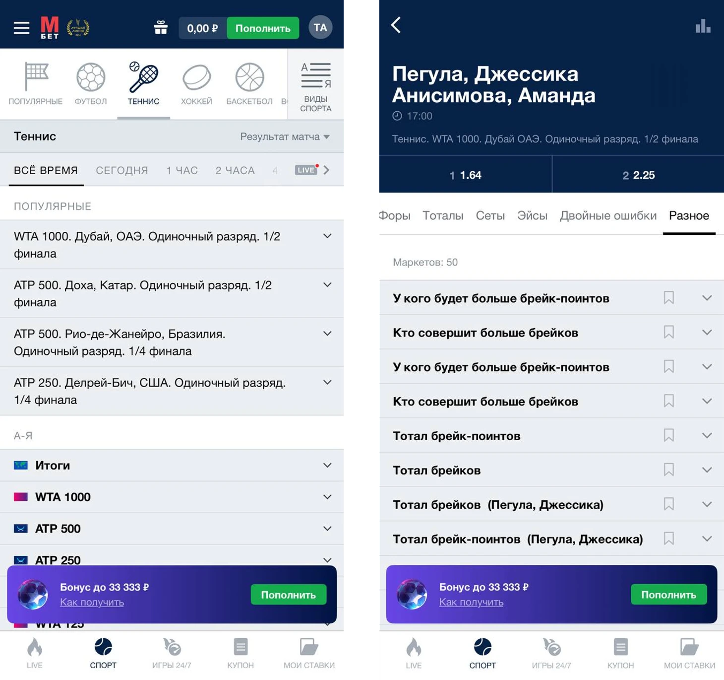 Среди доступных вариантов – основные исходы на матч и сет, тоталы и форы по геймам и сетам, комбинированные пари (результат + тотал сетов, результат + тотал геймов), европейский гандикап (на три исхода), статистика (количество эйсов, двойных ошибок, брейк-пойнтов, брейков), тотал тай-брейков. Доступны долгосрочные котировки на победителей Турниров Большого шлема (ТБШ), в линии представлены десятки игроков как для мужских турниров, так и для женских.