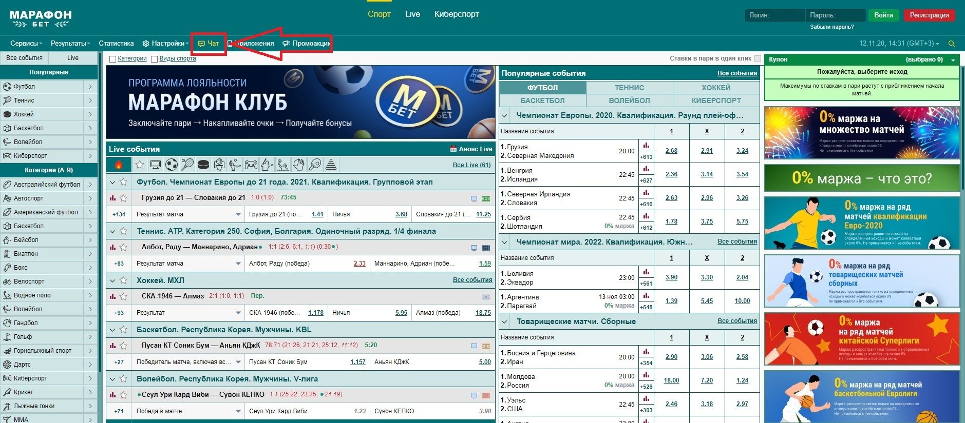 Значок «Чат» на главной странице сайта БК «Марафон»