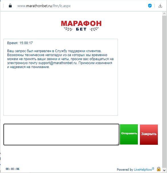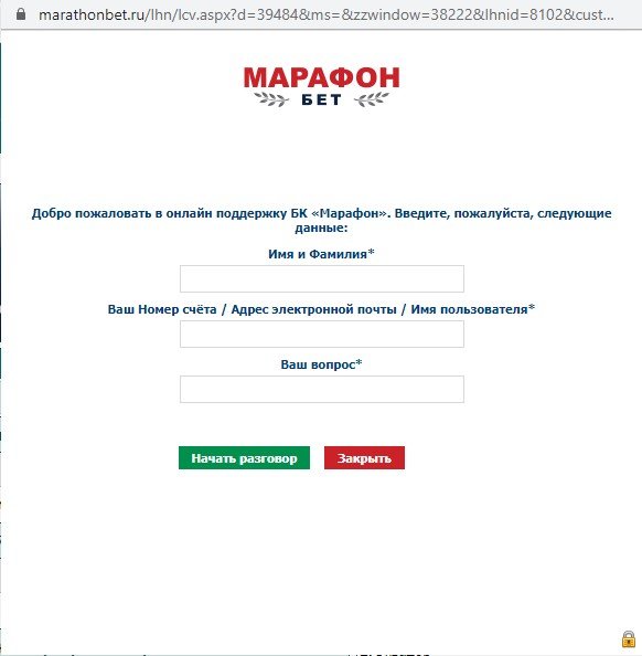 Значок «Чат» вы найдете в верхнем меню сайта marathonbet.ru. Чтобы связаться со службой поддержки БК «Марафон», нажмите иконку «Чат» — на экране появится форма, в которой нужно указать имя, логин и задать вопрос букмекеру. После нажатия кнопки «Начать разговор» появится окно диалога с оператором БК. Сотрудники службы поддержки быстро выходят на связь, во время ожидания ответа окно чата можно свернуть и продолжать пользоваться сайтом «Марафон».